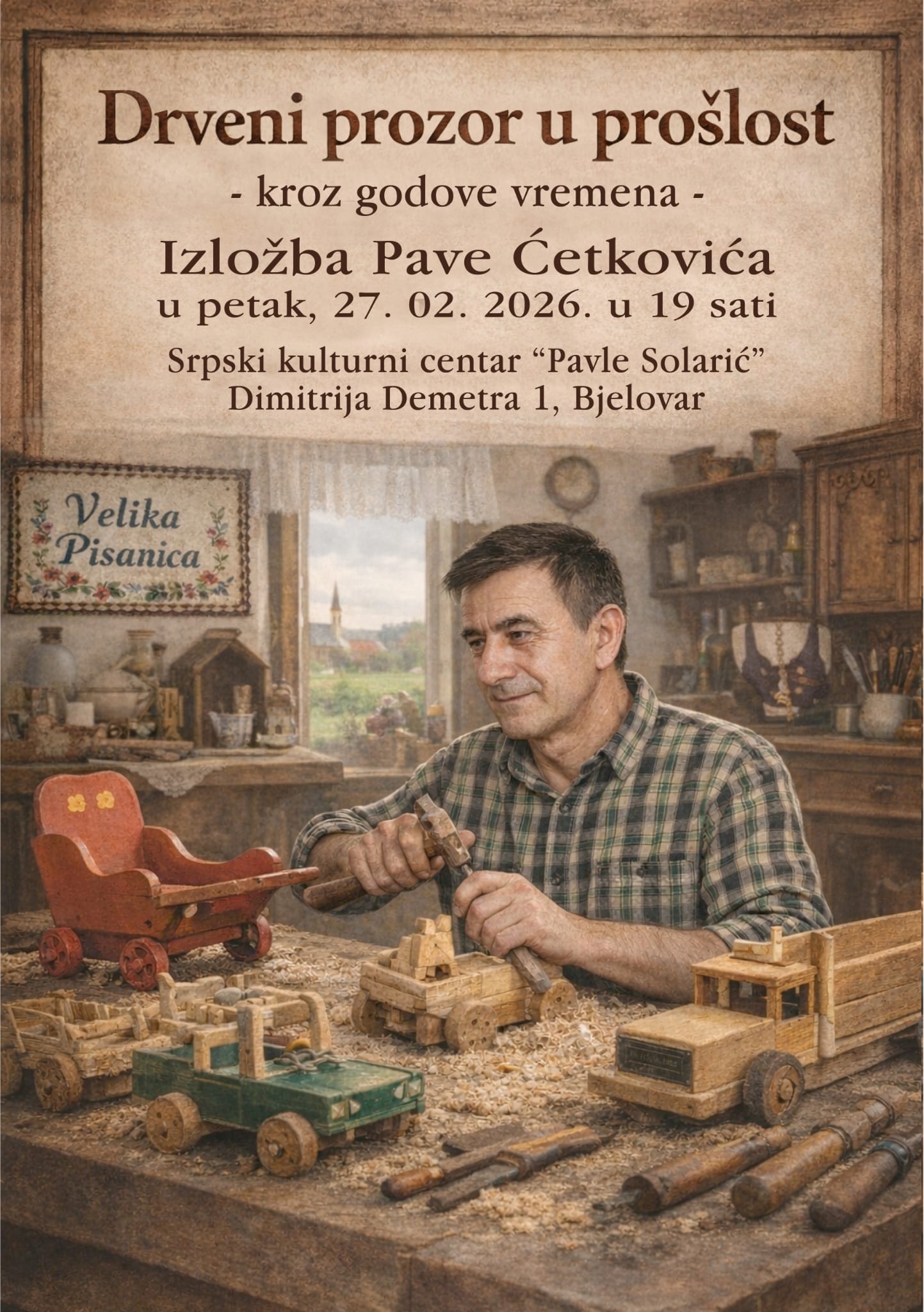 U petak, 27. veljače 2026. godine, u Srpskom kulturnom centru “Pavle Solarić”, Demetrova 1 u Bjelovaru bit će otvorena izložba „Drveni prozor u prošlost – kroz godove vremena“ autora Pave Ćetkovića, mještanina Velike Pisanice i vijećnika.