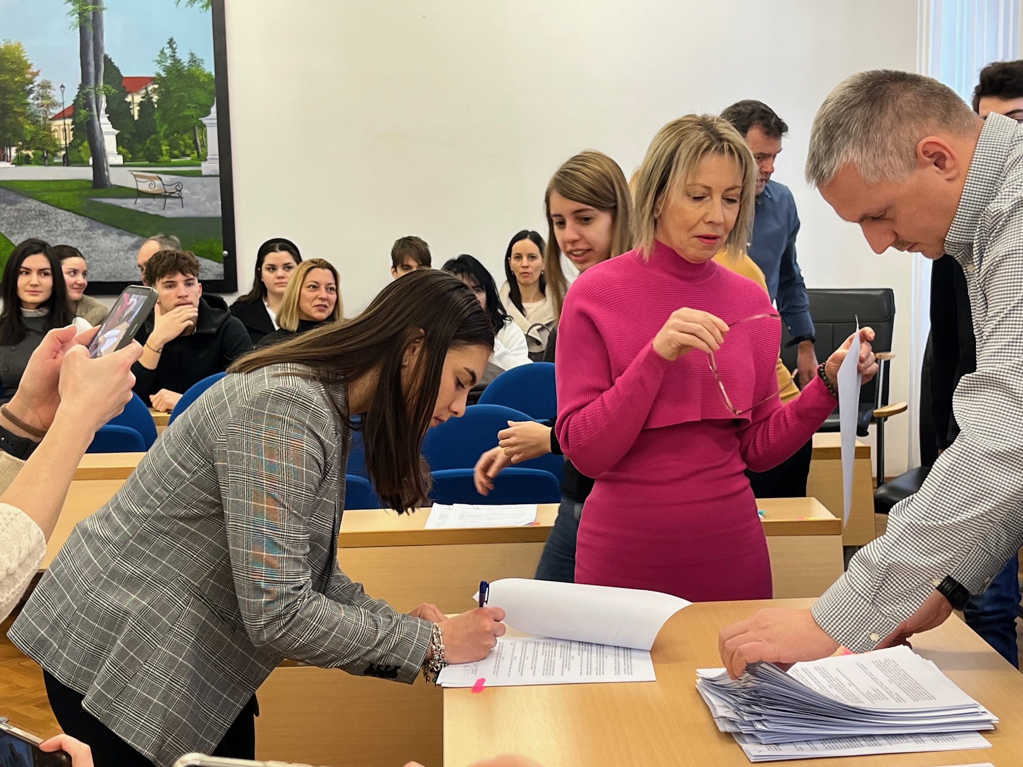 Gradonačelnik Bjelovara Dario Hrebak potpisao je ugovore s novim gradskim stipendistima. Grad Bjelovar i u akademskoj godini 2025./2026. nastavlja s dodjelom studentskih stipendija u iznosu od 130 eura mjesečno. Iznos stipendije ostao je isti kao i prošle godine, no povećan je broj korisnika. Na ovogodišnji natječaj prijavilo se 87 studenata, a kako je dio njih već ostvario pravo na neku drugu stipendiju očekuje se da će, nakon eventualnih odustajanja, stipendiju dobiti gotovo svi prijavljeni kandidati. Cilj gradske stipendije je rasteretiti studentski budžet i pomoći obiteljima u pokrivanju osnovnih mjesečnih troškova, poput prehrane. Grad stipendiranje ne veže uz obvezu povratka i rada u Bjelovaru nakon završetka studija, no mladima se šalje jasna poruka da su im vrata grada otvorena. Povratak se posebno potiče u deficitarnim zanimanjima, u kojima na bjelovarskom području postoji potreba za radnom snagom. Stipendiju su studenti dužni vratiti jedino u slučaju da ne završe studij. Među stipendistima su i studenti koji studiraju u Bjelovaru i oni koji su se odlučili za studij u drugim gradovima. Za mnoge od njih stipendija predstavlja značajnu financijsku pomoć, posebno u situacijama kada se studij plaća ili kada su troškovi stanovanja visoki. Buduća liječnica, sada brucošica, osječka studentica medicine Petra Aušperger nam je to i potvrdila. Petra se kada završi studij planira vratiti u Bjelovar. U svom gradu odlučio je i studirati Mario Vrabac, još jedan gradski stipendist koji je danas potpisao ugovor. Mario je brucoš na bjelovarskom računalstvu koje je upisao zbog dobrih preporuka. Kako se taj studij plaća gradska stipendija će mu, kaže, biti od posebne pomoći.