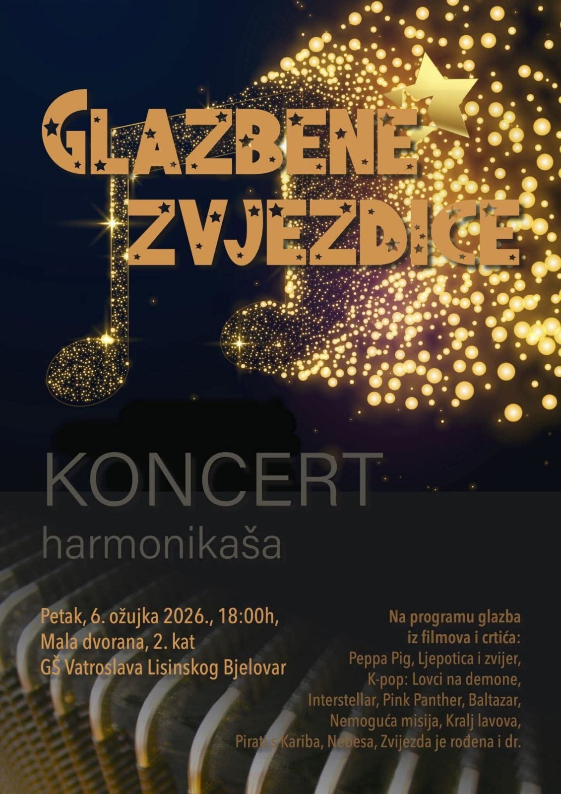 Riječ je o projektu profesora harmonike u bjelovarskoj glazbenoj školi, u sklopu kojeg će učenici izvoditi obrade poznatih skladbi i pjesama iz filmova i crtića. Publika će tako moći uživati u glazbi iz naslova poput „Peppa Pig“, „Ljepotica i zvijer“, „Interstellar“, „Pink Panther“, „Nemoguća misija“, „Kralj lavova“, „Pirati s Kariba“, „Zvijezda je rođena“ i drugih.
