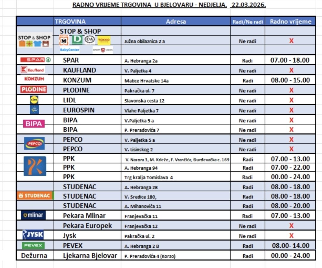 Nedjeljna kupovina u Bjelovaru i ove je nedjelje prava mala lutrija, ali dobra vijest je da nisu svi izlozi spušteni. Ako ste u zadnji čas shvatili da vam u kući nešto nedostaje, još nije kasno, dio trgovina i danas radi, a znamo i koja je ljekarna dežurna. Ukratko, tko je zaboravio sitnicu ili mu se baš danas shopingira još ima šanse.