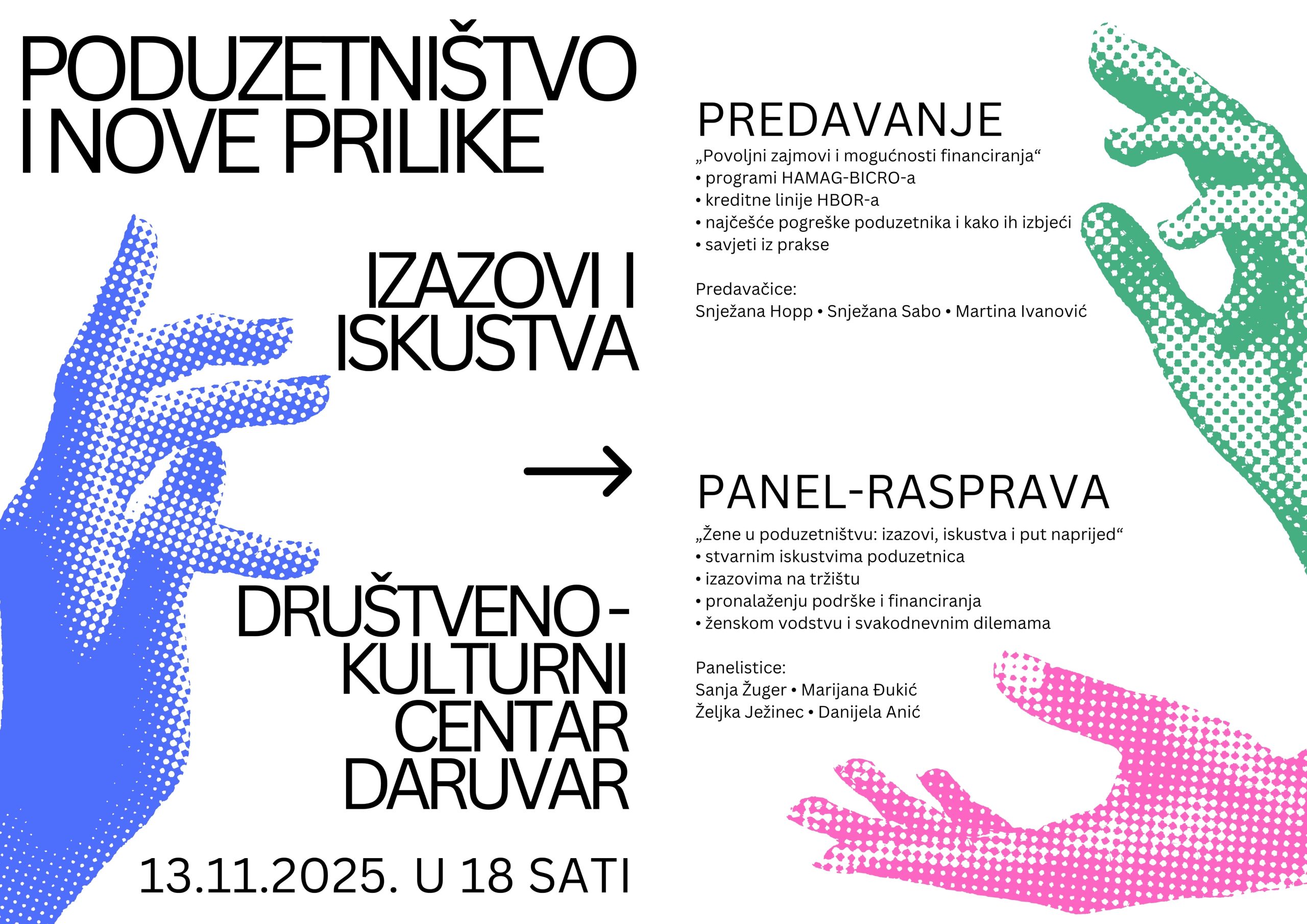 Daruvar će 13. studenoga 2025. postati središte poduzetničkih ideja i prilika za razvoj poslovanja. U Društveno-kulturnom centru Daruvar s početkom u 18 sati održat će se edukativni susret na temu „Poduzetništvo i nove prilike – izazovi i iskustva“, namijenjen obrtnicima i malim poduzetnicima koji žele saznati više o aktualnim mogućnostima financiranja, poticajima te praktičnim savjetima za unapređenje poslovanja.
