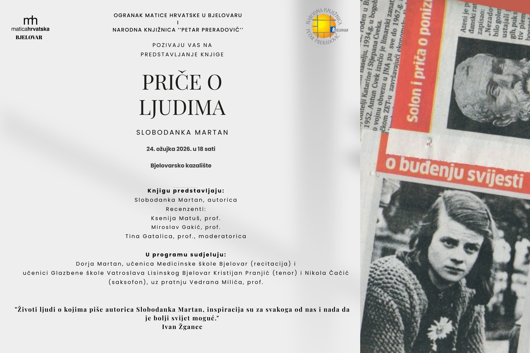 U Bjelovaru će se sutra, 24. ožujka, održati predstavljanje knjige Priče o ljudima autorice Slobodanke Martan. Događaj organiziraju Matica hrvatska – Ogranak u Bjelovaru i Narodna knjižnica Petar Preradović, a održat će se u Bjelovarsko kazalište s početkom u 18 sati.