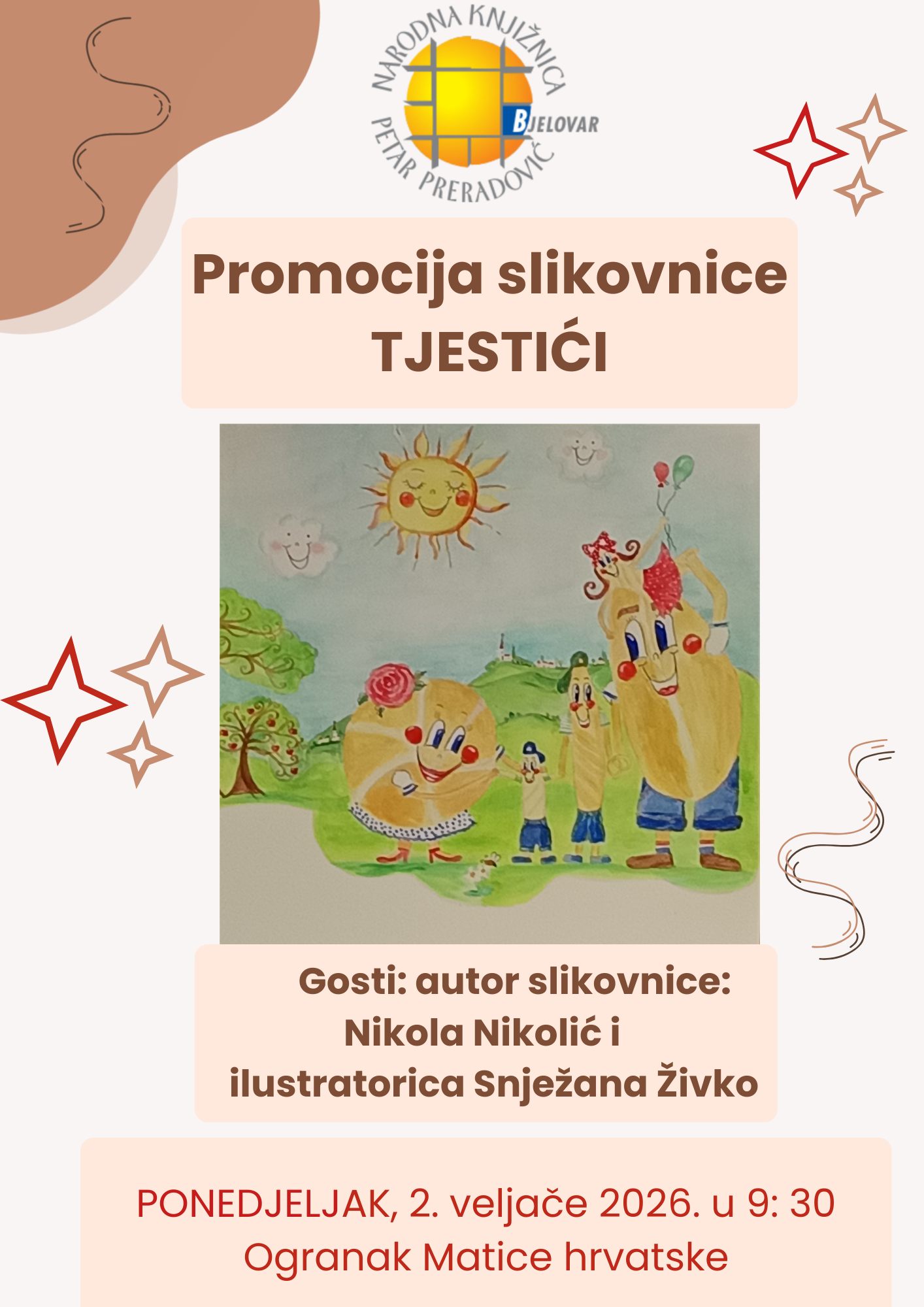 U ponedjeljak, 2. veljače u 9:30 sati, u prostoru Ogranka Matice hrvatske u Bjelovaru (Trg Eugena Kvaternika 7a) održat će se promocija slikovnice „Tjestići“, uz susret s njezinim autorom, bjelovarskim piscem Nikolom Nikolićem.