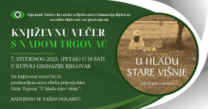Ogranak Matice hrvatske u Bjelovaru i Gimnazija Bjelovar pozivaju sve ljubitelje književnosti na promociju zbirke pripovjedaka Nade Trgovac „U hladu stare višnje”, koja će se održati u petak, 7. studenoga 2025. godine, s početkom u 18 sati u kupoli Gimnazije Bjelovar.