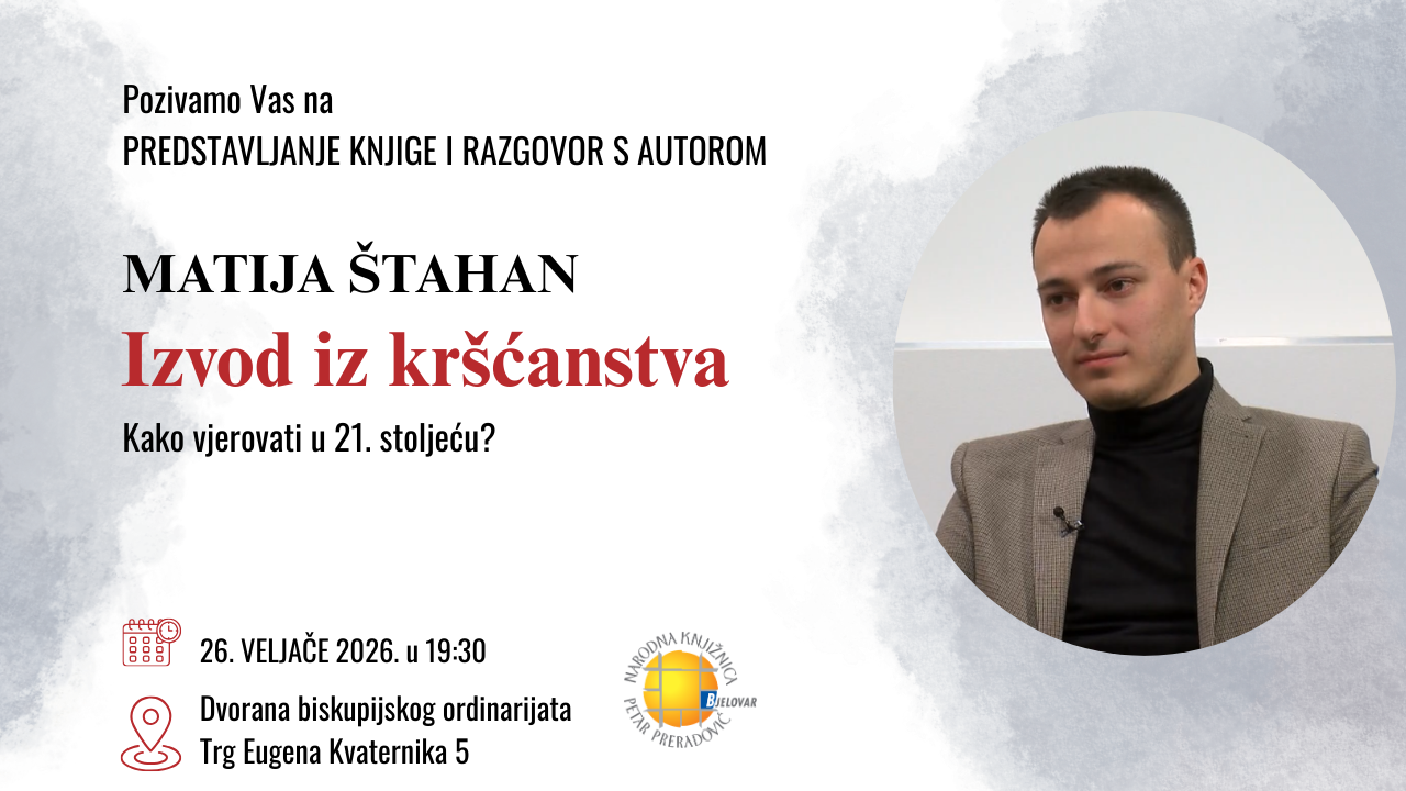 U organizaciji Narodna knjižnica “Petar Preradović” u srijedu, 26. veljače 2026. godine, s početkom u 19:30 sati, u Dvorani Biskupijskog ordinarijata održat će se predstavljanje knjige „Izvod iz kršćanstva: kako vjerovati u 21. stoljeću“ autora Matija Štahan.