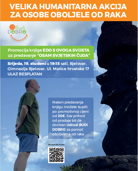 Ove srijede, 19. studenog, od 19.15 u kupoli Gimnazije Bjelovar organizirano je predstavljanje knjige dr. Ede Toplaka „Edo s ovoga svijeta“ uz predavanje „Osam svjetskih čuda“. Najavljeni susret dio je velike humanitarne akcije za osobe oboljele od raka, gdje se sav prihod od prodaje knjige donira udruzi “Budi dobro”.
